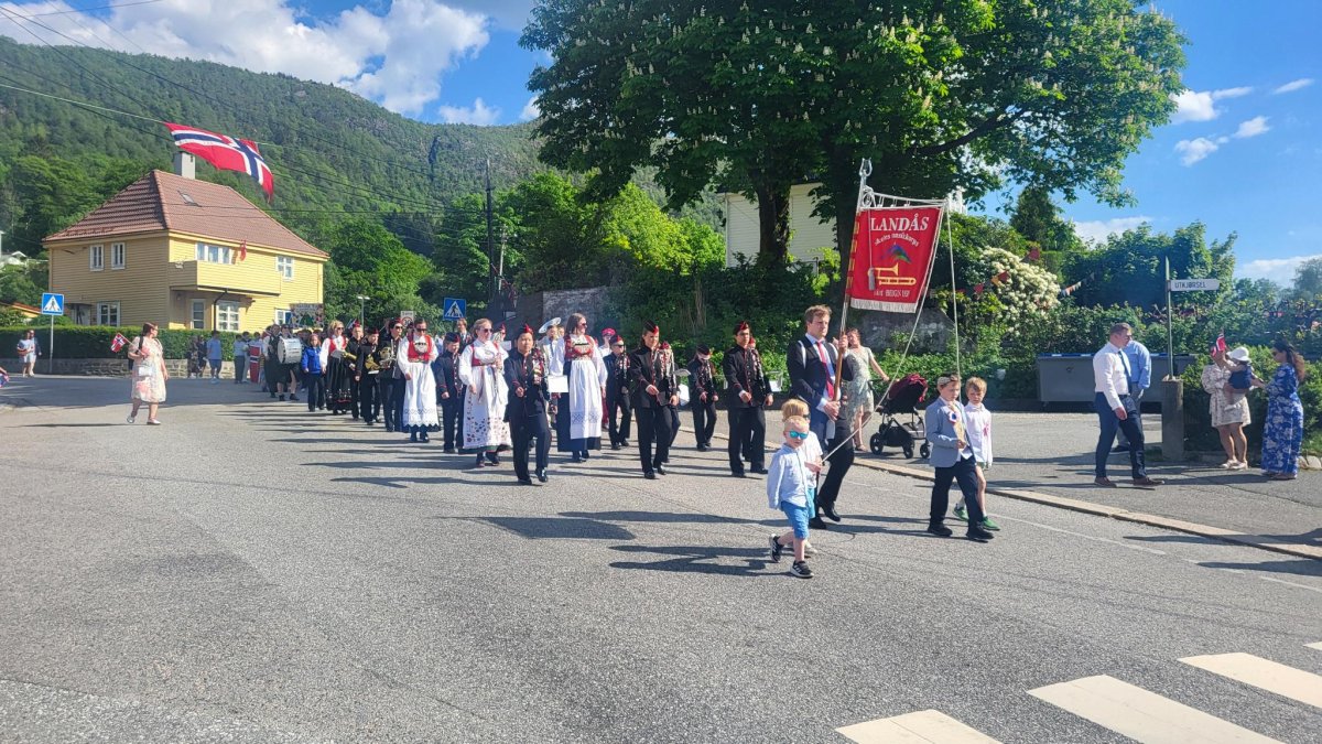 Tidenes varmaste 17. mai i Bergen, og Landås skoles musikkorps spelte både i flaggtoget i sentrum og i skuletoget på Landås.